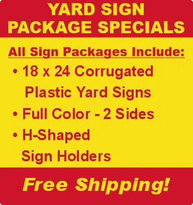 Corrugated Yard Sign Specials – Discounted full color 18 x 24 corrugated yard sign packages including h-shaped wire sign holders and Free Shipping!